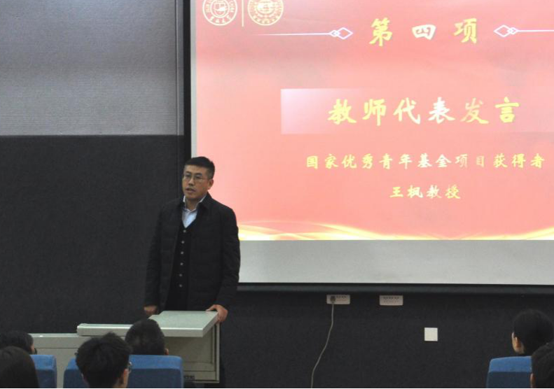 教师代表,国家优秀青年科学基金项目获得者王枫教授发言。他首先代表学院全体教师欢迎各位新同学的到来。王枫从自己读研期间的感受出发,以“新鲜”、“焦躁”、“兴奋”三个关键词入手勉励同学们要惜时、自强、博学,充分利用在校学习的黄金阶段,既要脚踏实地学习,也要不忘仰望星空,保持对未来科学领域的热情与执著。