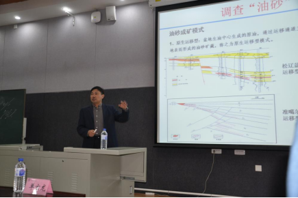 单玄龙院长首先从国家建设发展战略和需求,国际新型地下能源利用现状入手,对新时代的地球科学进行了定位:新时代的地球科学肩负着为国家探寻地下新能源、为国家巨大能源需求填补缺口的重要使命,是在当今“世界未有之大变局”中维持中国国际地位至关重要的一环,是新时代实现中华民族伟大复兴不可或缺的一环。单玄龙院长以未来石油资源的重要接替资源——油砂为例,向同学们介绍了非常规资源在世界能源结构中的重要地位。他表示,我国油砂资源主要分布在新疆、青海、西藏、四川、贵州、广西、浙江、内蒙等地区,资源量丰富,开发开采潜力大,对国家发展意义深远。他鼓励同学们应自强不息,自信满满地接过国家未来科学战略规划和经济繁荣发展的接力棒。